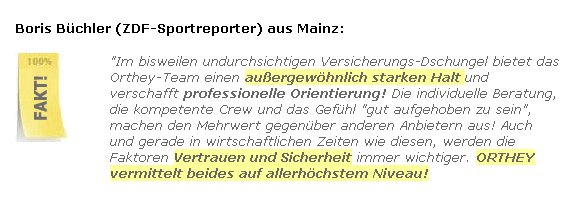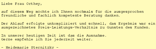 „Liebe Frau Orthey, durch Sie spare ich ab sofort bei meinem Unfallvertrag Jahr für Jahr 280,- Euro. Dafür nochmals meinen aufrichtigen Dank!“.