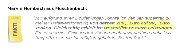 Ich konnte es kaum glauben, was ich da auf dem Bildschirm las, … beeindruckende Erfahrungsberichte von anderen Kunden, … die allesamt von gigantischen Erfolgen berichteten. Meine Neugier war geweckt! Ich kramte flux unsere Police aus dem Ordner, … und machte den kinderleichten Online-Check. Innerhalb von nur 3 Minuten war ich durch, … und was soll ich sagen: … Ich sparte bei unserer Familienunfallversicherung sage und schreibe 397,- Euro pro Jahr. Da war ich baff, … und mein Mann auch. Sie hätten seine Augen sehen sollen, als ich ihm abends von meinen Erfolgen berichtete …